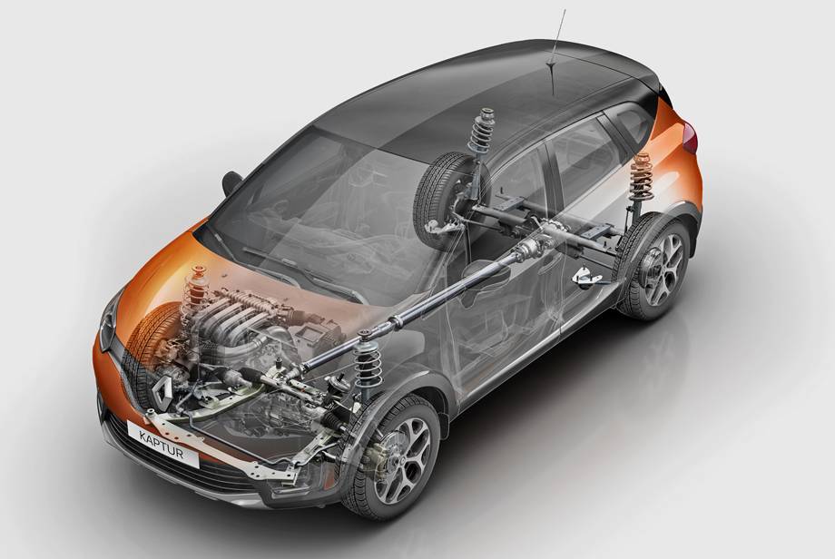 От европейского кроссовера Captur если сравнить наш Kaptur (Каптур) отличается не только элементами дизайна и возросшими габаритами. В основе первого — платформа хэтчбека Clio с жёсткой короткоходной подвеской, а у второго — модернизированная «тележка» B0, знакомая по непробиваемому Дастеру. В нынешнем виде её зовут Global Access и по-модному именуют модульной: на ней построены и хэтчбеки, и кроссоверы с минивэнами. В зависимости от типа привода задняя подвеска, как и у Дастера, — полузависимая или независимая, передняя ― всегда McPherson. Шасси Каптюра отличается от дастеровского изменённым передним подрамником, иными передними рычагами, перекалиброванными пружинами и амортизаторами. Передний стабилизатор отныне привулканизирован к втулкам.