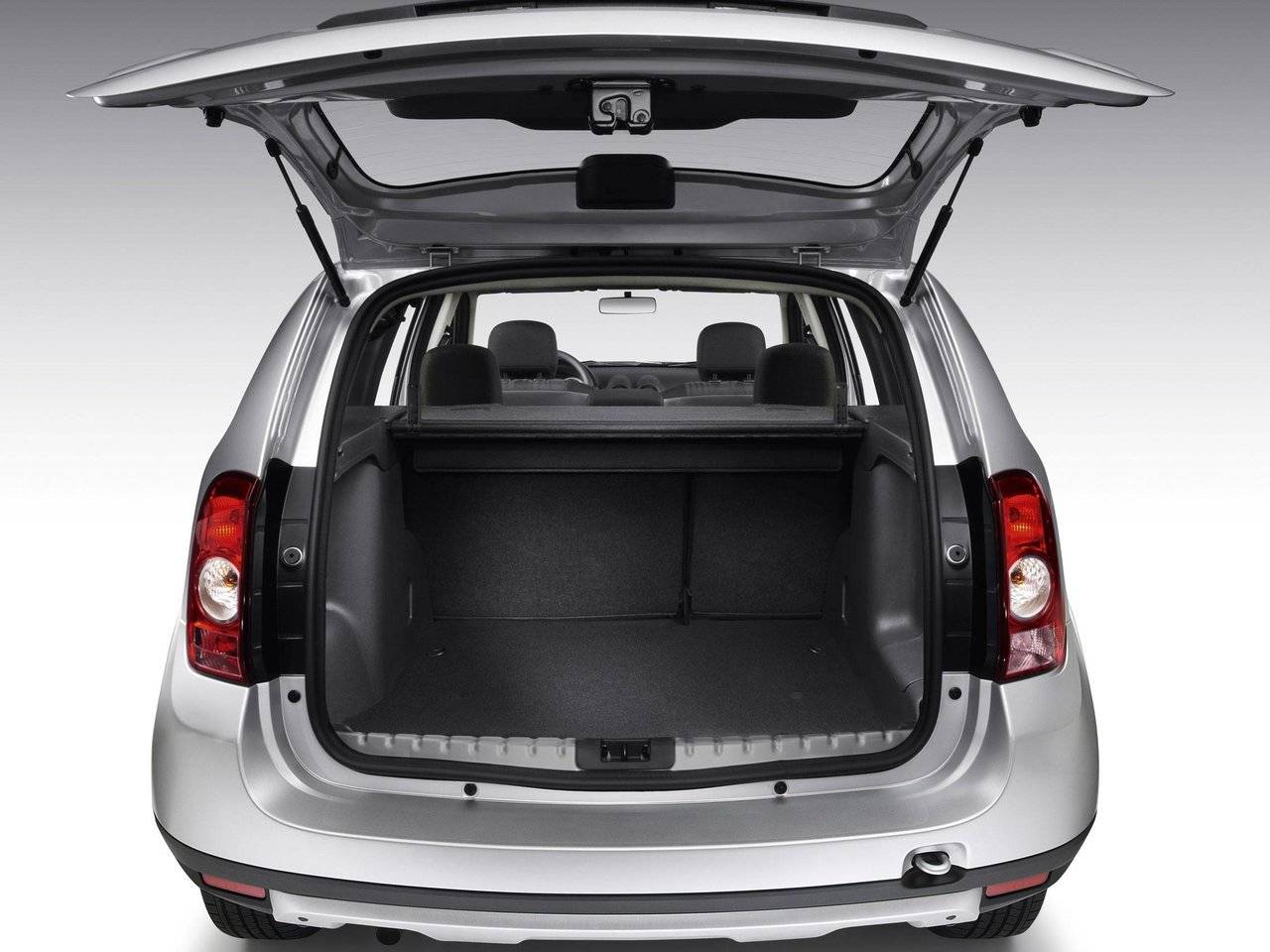У Duster вместительный багажник. Объем моноприводной версии 408 литров, а 4×2 — 475 кубических дециметров. Сложенные задние диваны помогают увеличить полезную площадь до 1 570 и 1 636 литров. В полноприводной версии при сложенных сидениях получится ровный пол, а глубина отсека составит 1 880 мм. Если отклонить спинку переднего сиденья вперед, появится возможность перевозить вещи длиной до 2,5 м.