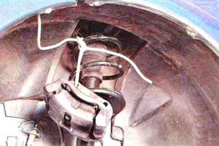 - После того как сняли колесо, нам необходимо, отключить датчик АБС если у вас машина с датчиком. Отключается он очень легко, выдергивается из пружинки и все!
