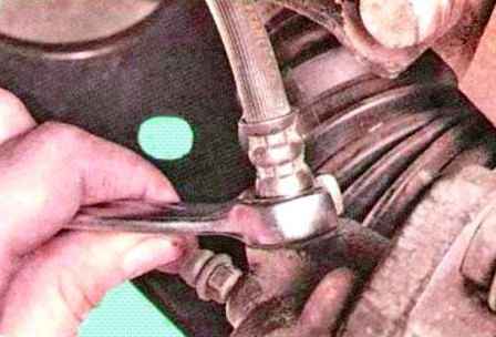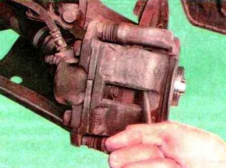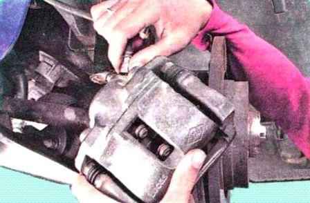 Снимаем суппорт с поворотного кулака и отсоединяем его от тормозного шланга, свинчивая суппорт с наконечника шланга.