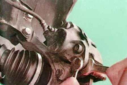Снятие приводов передних колес проводим при демонтаже коробки передач или силового агрегата, при замене самих приводов, замене грязезащитных чехлов внутренних и наружных шарниров приводов. Правый привод снимаем также для замены его сальника, а левый — для замены подшипника чехла внутреннего шарнира.