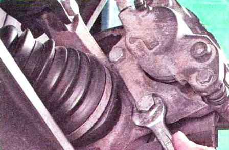 - При помощи торцевого ключа на «18» снимите два болта, которые удерживают суппорт. Откручивание данного элемента часто вызывает сложности, поэтому используйте подготовленную трубу. Она выступит в качестве рычага.