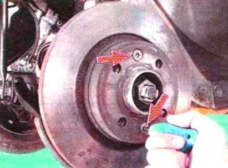 Выкручиваем два винта крепления тормозного диска к ступице переднего колеса.