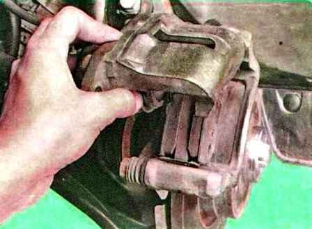 Снимаем суппорт в сборе, как описано выше, только не отсоединяем тормозной шланг и подвязываем суппорт к пружине подвески.