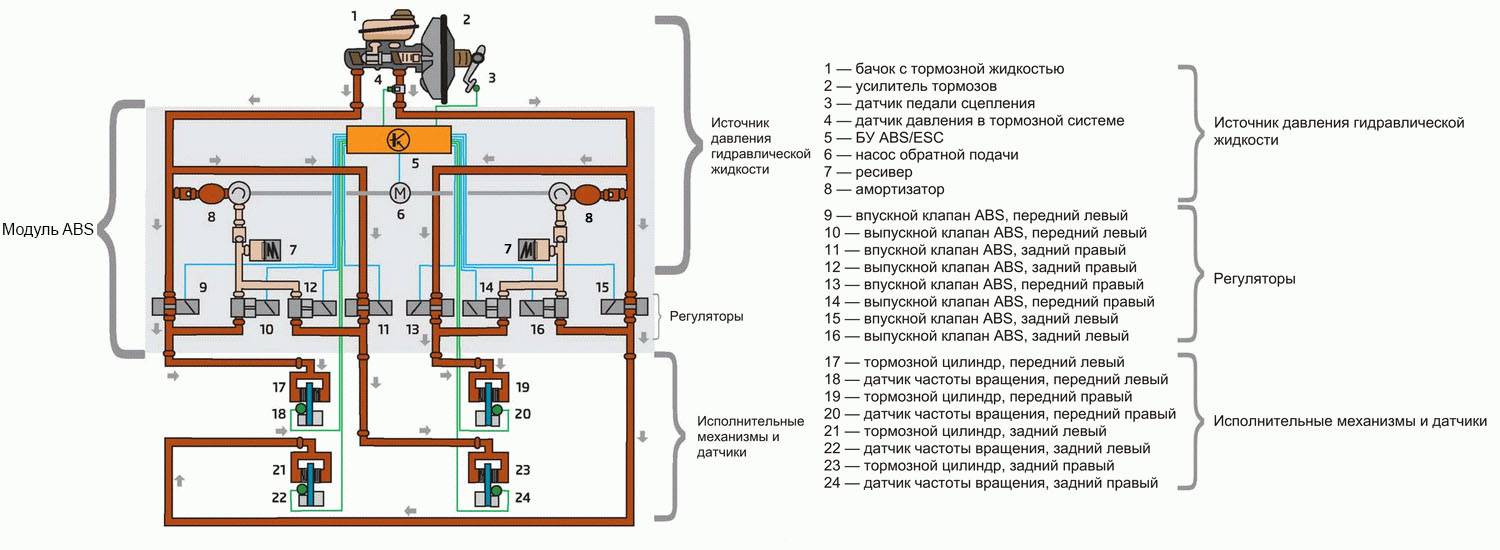 Начиная диагностику АБС своими руками, необходимо понимать из каких элементов состоит вся система. К числу ее основных элементов относится: