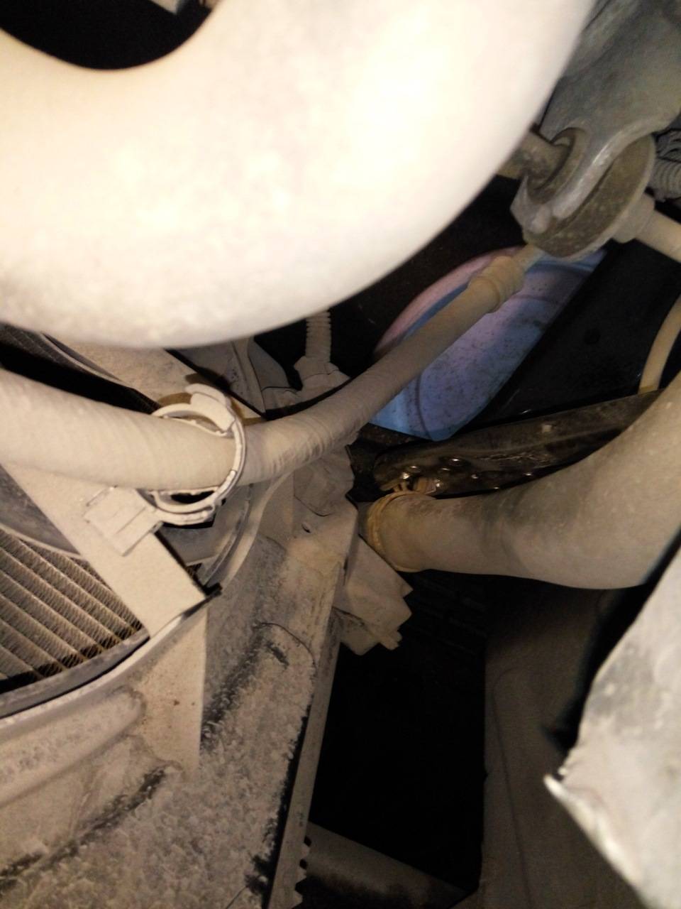 в нише, которая открылась после снятия воздушной гофры, внизу радиатора, находим толстый шланг. С него нужно снять хомут и потянуть шланг вверх, для его снятия. Начнется слив антифриза, предварительно под этим местом мы располагаем емкость для слива (Рис.3);