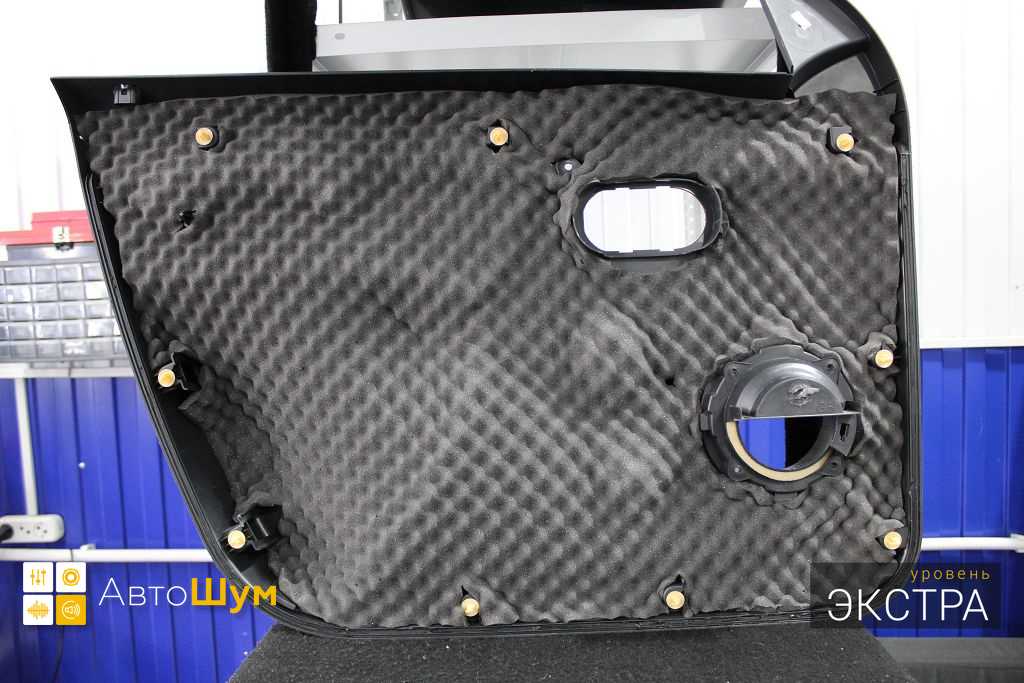 Внутренние дверные стенки также покрываются вибродемпфером Comfort mat Dark D3. В качестве последнего слоя используется шумопоглотитеть Comfort mat Lock.