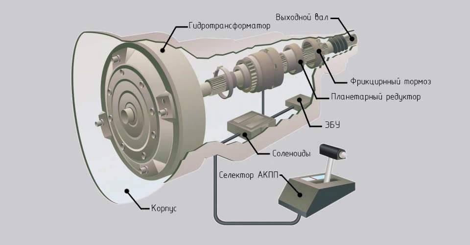 За работу автоматической коробки передач отвечает блок управления. Скоростной режим устанавливается в зависимости от информации, полученной от датчиков. Узел состоит из гидротрансформатора и планетарного механизма. АКПП работает в четырех режимах:
