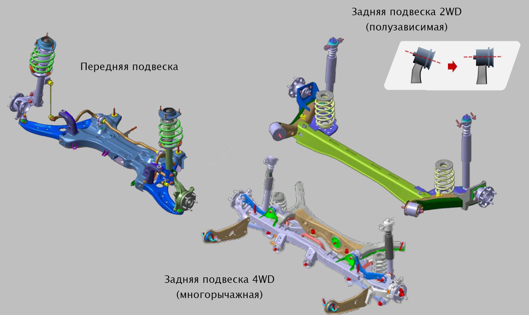 - задняя подвеска полузависимая с торсионной балкой (передний привод) или независимая многорычажная архитектура (полный привод);
