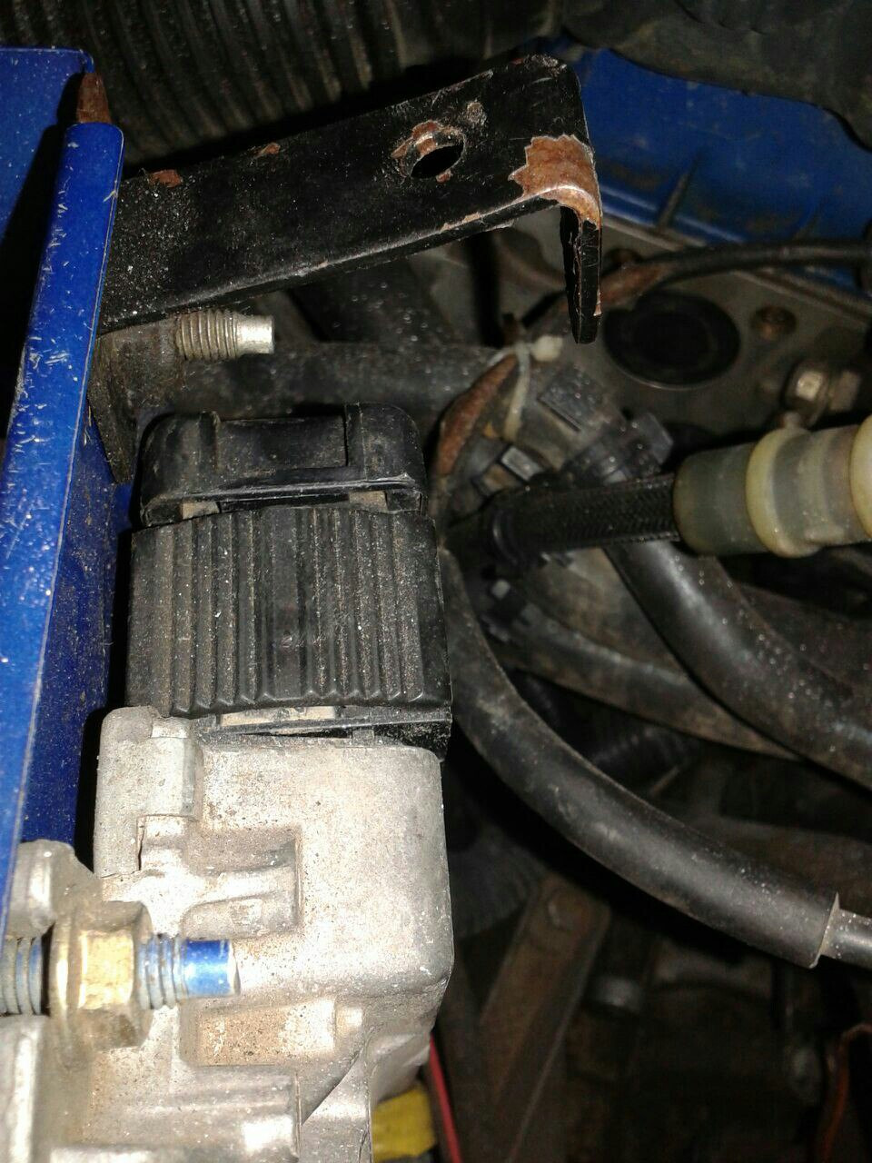 Распылим WD–40 по кронштейну датчика и выкрутим крепёжный болт, удерживающий устройство. Молотком простучим металл в месте крепления и аккуратно раскачаем деталь. Извлечём её, поддев плоской отвёрткой.