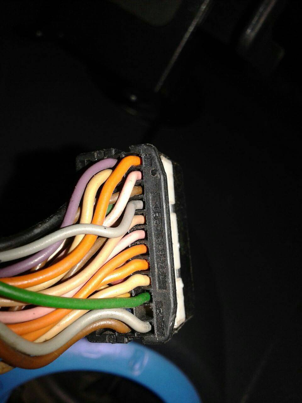 Теперь нежно без усилия снимаем колодку с мозга и находим на ней 53 контакт (Крайние контакты в каждой линии каждой половинки пронумерованы на пластике, посчитать легко) и вставляем в него тонкий щуп. У меня такого тонкого не нашлось, использовал обычный провод.
