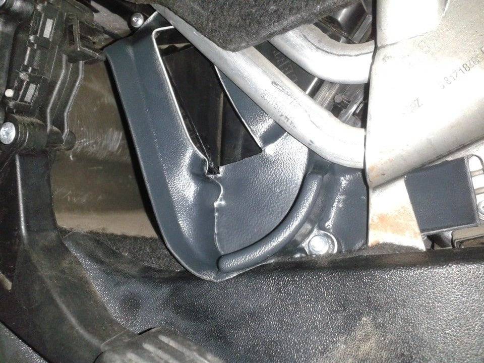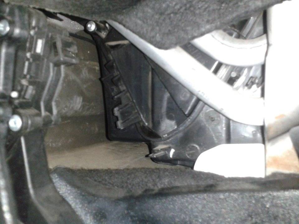 Дальнейшие работы делаются из салона автомобиля. Отверткой Т20 выкручивается саморез, удерживающий боковую пластиковую панель со стороны водителя. Из ковролина возле педали газа удаляется пластиковая клипса. В результате открывается доступ к нижним болтам крепления кронштейна усилителя панели.