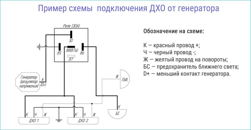 Подключение ДХО от генератора – самая простая из имеющихся схем. При её реализации ДХО включаются в тот момент, как включается двигатель (генератор).