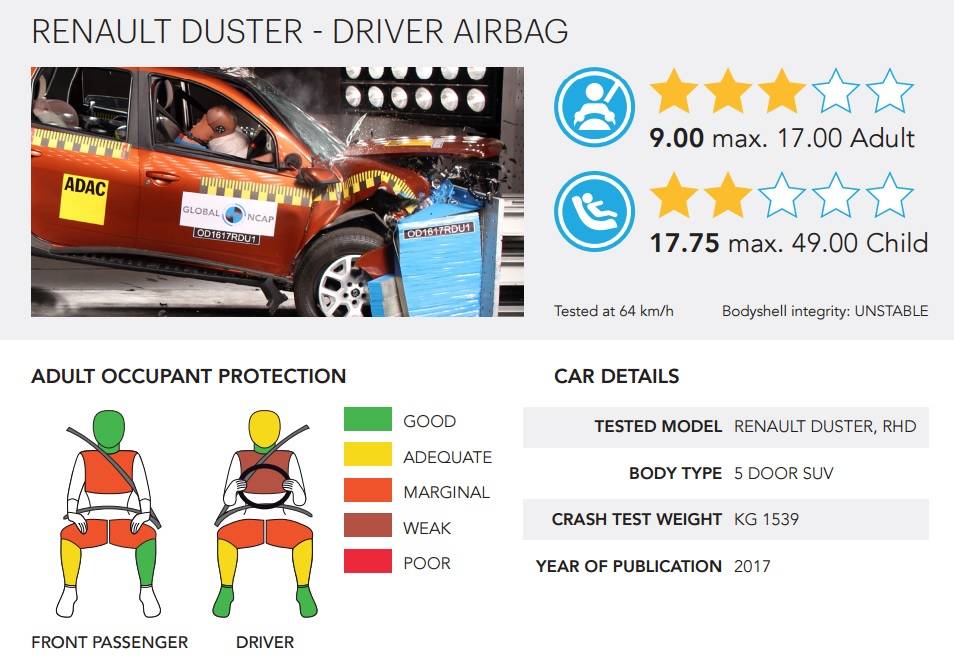 Как отмечают специалисты Global NCAP Renault Duster в целом не заслуживает ни одной звезды, даже несмотря на 3-х и 4-х «звездные» оценки автомобилей представленных на некоторых зарубежных рынках.
