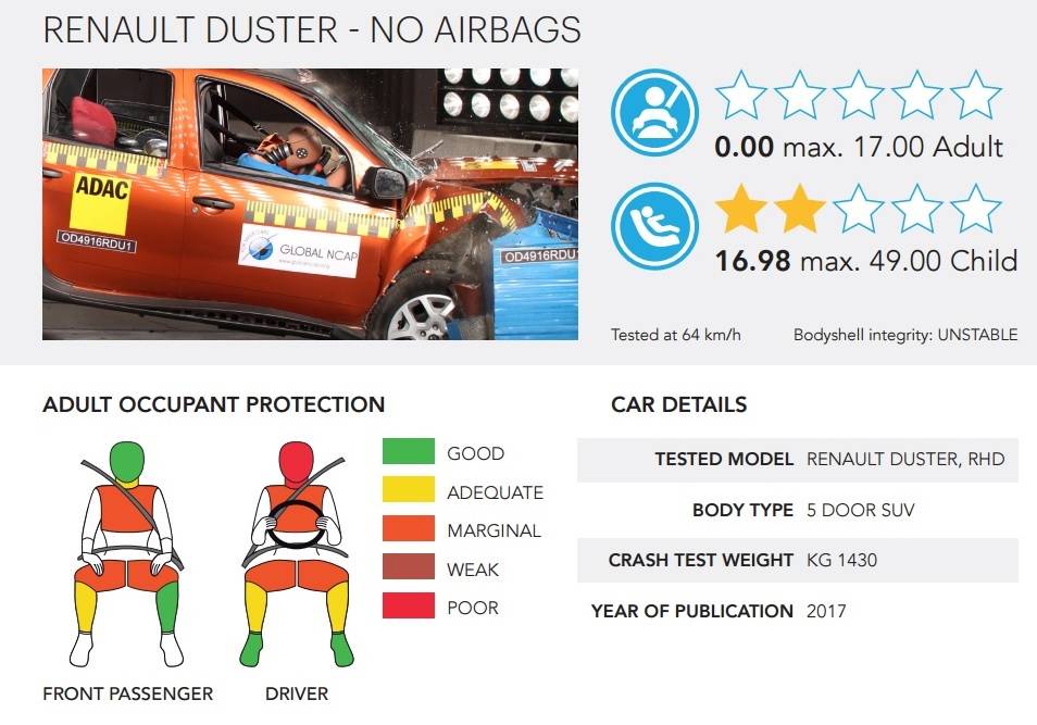 Базовая версия Renault Duster без подушек безопасности доступная на Индийском рынке стала очередным автомобилем, которому не удалось получить ни одной звезды безопасности по итогу краш-тестов проведенных Global NCAP.