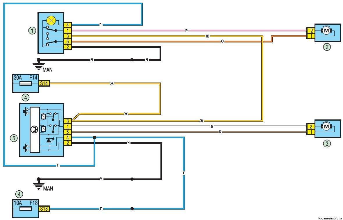 Схема электропривода зеркал Renault Logan 1 — блок предохранителей в салоне; 2 — блок управления наружными зеркалами заднего вида; 3 — электропривод левого наружного зеркала заднего вида с обогревом; 4 — электропривод правого наружного зеркала заднего вида с обогревом. Реле же коммутируют высокие токи в защитном кожухе распределительного щитка, что также в разы снижает вероятность возгорания.