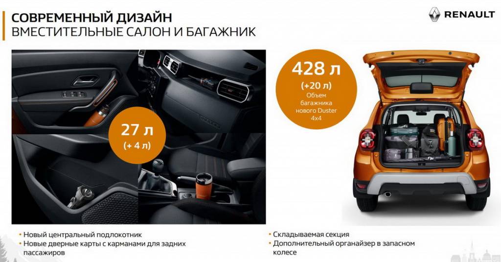 Объем багажника прибавил 20 литров: на полноприводном Duster он составляет 428 литров до полки, 662 литра до потолка и 1720 литров со сложенными сиденьями. Под полом багажника появился органайзер вокруг запасного колеса. Спинки задних сидений складываются отдельным рычагом в пропорции 40:60 и укомплектованы новыми подголовниками L-образной формы, которые не ограничивают обзор назад.