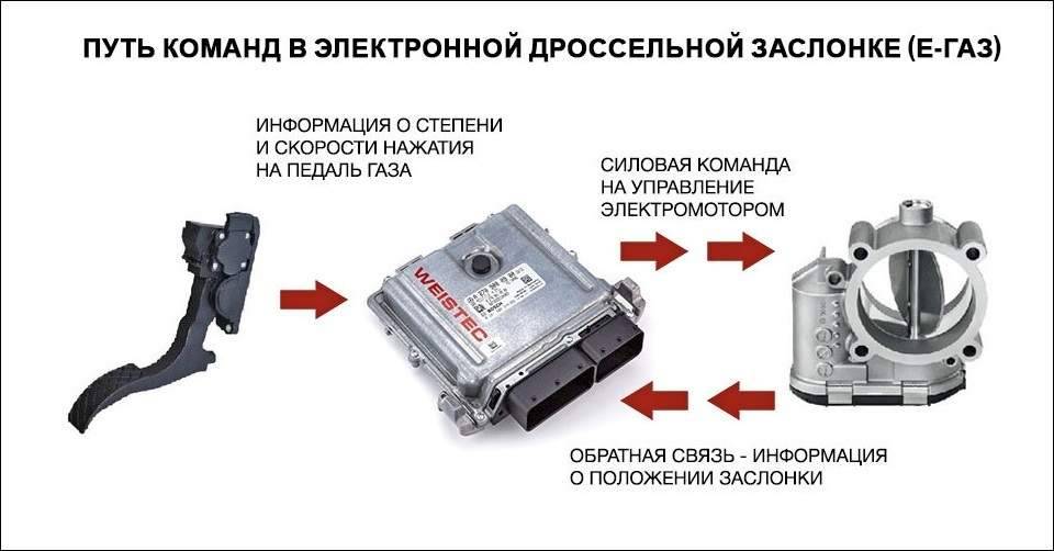 Так работает новая технология Е‐газ. Принцип её действия значительно сложнее, чем обычное натяжение и ослабление механического троса. Тут возможно много ошибок, связанных с датчиками и прочими компонентами.