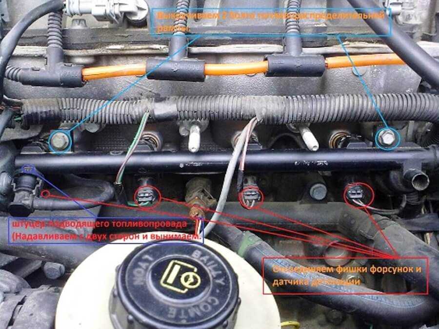 Естественно, что на двигателе мы не сможем прочистить форсунки таким способом, поэтому придётся их демонтировать. Для этого не обязательно снимать ресивер и дроссель, его можно снять только в том случае, если он нуждается в чистке, а форсунки демонтируем по простому алгоритму: