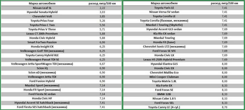 Таблица с рейтингом машин по расходу топлива на 100 км