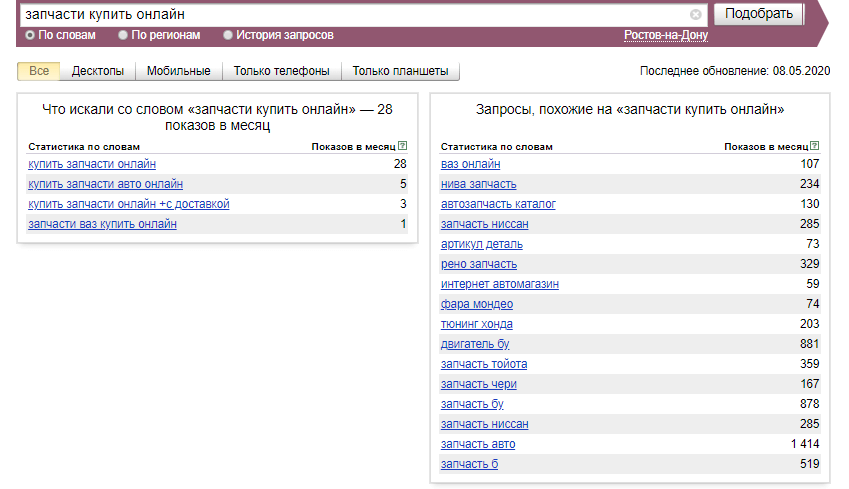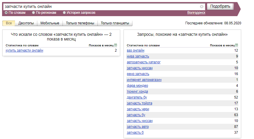 Также стоит обратить внимание на низкочастотные запросы: по ним будет легче продвигаться, если в регионе у вас есть крупные конкуренты. Сравните: вот запросы по покупке запчастей онлайн в Волгодонске за последний месяц