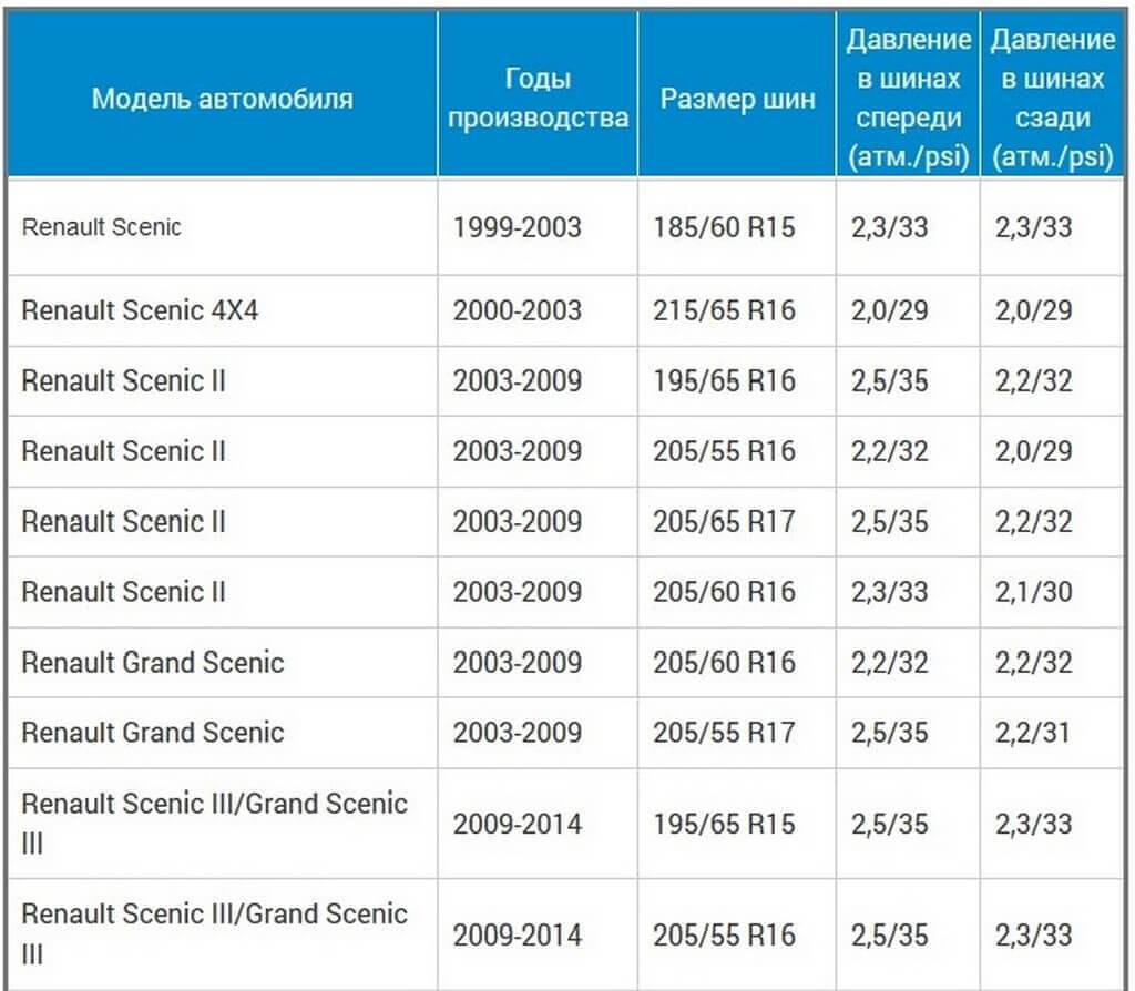 Таблица с нормативным давлением в шинах авто Рено Сценик