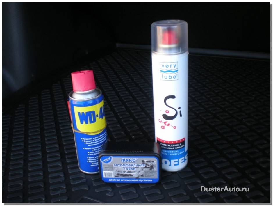 Зимой нередко случается, когда двери примерзают в самое неподходящее время. Дастеру это присуще еще в большей мере из-за особенностей конструкции его дверей. Чтобы избежать подобных проблем нужно подготовить все резиновые уплотнители. Для этого используем силиконовую смазку в аэрозольном баллончике и поролоновую губку, подойдет губка с силиконом для натирки панелей.