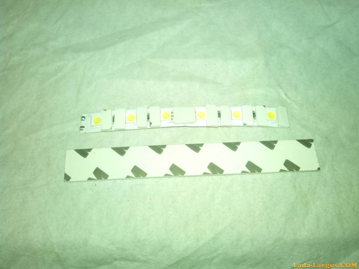 Взял светодиодную ленту и отрезал 6 диодов, 9 не влезло бы, наклеил двухстороннию ленту для крепежа ленты в плафоне.