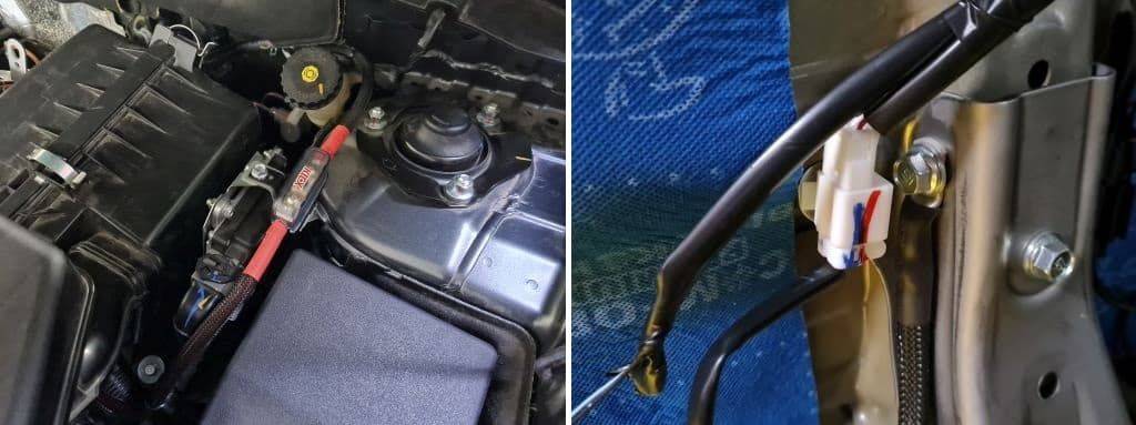 Начинаем с силовой проводки. Плюс берем со штатного аккумулятора под капотом. Так как усилители будут расположены далеко (в багажнике) от аккумулятора, то берем сечение провода с запасом, а именно 4 Ga (25 мм). Для обеспечения безопасности такого длинного кабеля устанавливаем главный предохранитель на расстоянии 30 см от плюсовой клеммы. Крепление предохранителя делается из металлической шины, вся подводка дополнительно защищена “змеиной кожей”, а клеммы термоусадкой и пастой.
