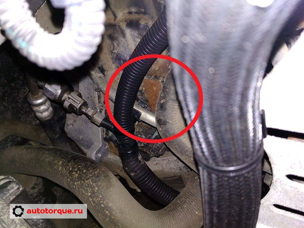 Дизель 1.5 К9К (90 л.с.) хоть и редко встречается на Дастерах, но вопросов по местонахождению его номера двигателя гораздо больше. Дело в том, что визуальный доступ к нему возможен только при помощи зеркала и фонарика. Расположена маркировка тоже в передней части под тоннелем масляного щупа: