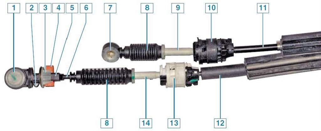 Тросы выбора и включения скоростей МКПП: 1 — наконечник троса для выбора скоростей, 2 — демпферная пружина, 3 — фиксирующая втулка, 4 — фиксатор зубчатый, 5 — наконечник выбора скоростей. 6 — конец троса зубчатый, 7 — наконечник троса для включения скоростей, 8 — чехол защитный, 9 — трубчатый наконечник троса для включения скоростей, 10 — втулка установочная включения скоростей, 11 — оболочка из пластика троса для включения скоростей, 12 — оболочка из пластика троса для выбора скоростей. 13 — втулка установочная выбора скоростей, 14 — трубчатый наконечник троса для выбора скоростей.