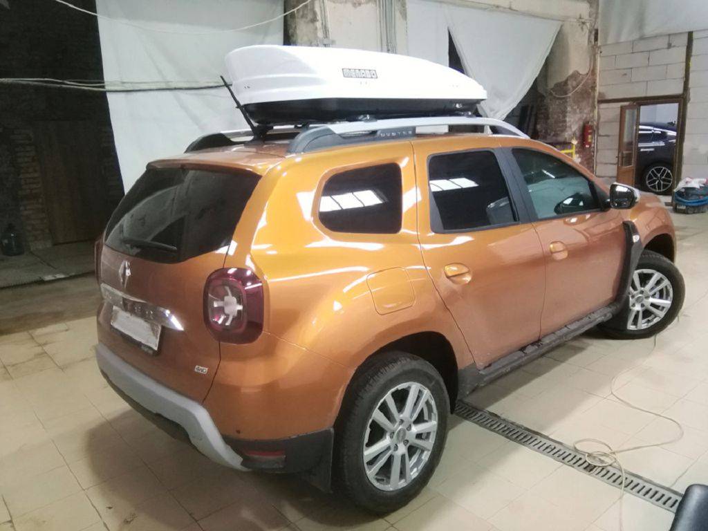 Для этого можно использовать стандартные рейлинги, которые доступны во всех комплектациях нового Дастер, кроме самой дешевой версии Access. Потребуется приобрести не только сам бокс, но и специальные крепления-дуги, код оригинального аксессуара: 8201709063, их стоимость составит более 16 тысяч рублей, но можно подобрать аналоги дешевле. Оригинальный бокс (код: 7711821647) стоит более 50 тысяч, но также полно неплохих аналогов.