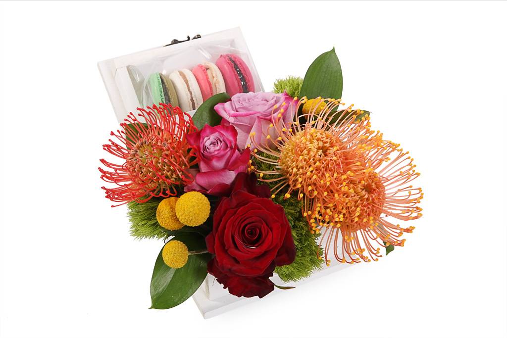 - Букет-шкатулка. В состав композиции, кроме цветов, обычно входят свежие ягоды или сладости.