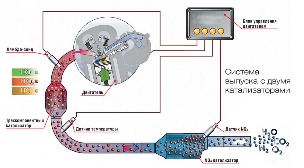 Выхлопные газы двигателя содержат опасные вещества, которые наносят вред окружающей среде. К ним относятся оксиды азота, углеводороды и оксид углерода. Трехступенчатый катализатор превращает их в менее вредный диоксид углерода, воду и азот.