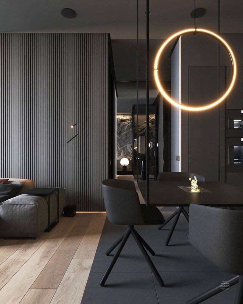 Такой тип светильников не слишком популярный, но он достаточно распространен при определенном дизайне. Трековый светильник представляет собой точечный источник света, обычно спот, который размещается на длинной планке – рельсе. Благодаря скользящим токосъемникам он может свободно передвигаться по этой рельсе. Таким образом, удается оперативно изменить схему освещения в зависимости от поставленных задач или просто от настроения.