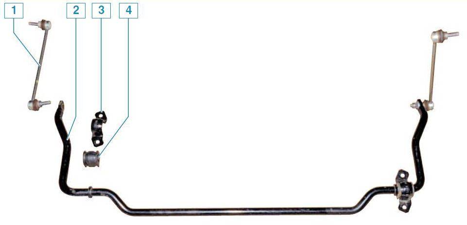 Элементы стабилизатора поперечной устойчивости: 1 – стойка стабилизатора; 2 – штанга; 3 – скоба; 4 – подушка