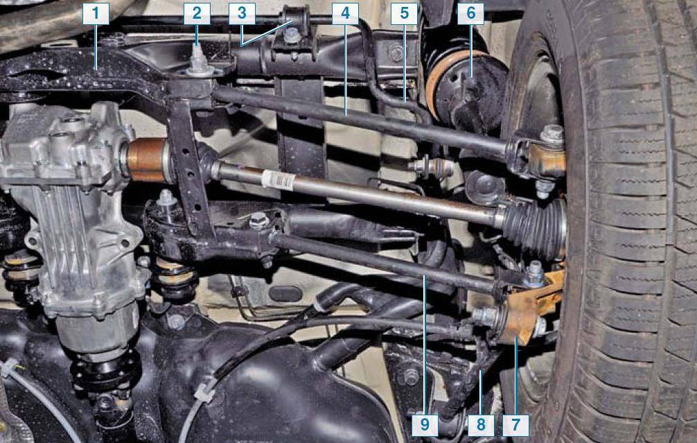 Элементы задней подвески на автомобиле: 1 – подрамник; 2 – болт с эксцентриковой шайбой; 3 – скоба крепления штанги стабилизатора поперечной устойчивости; 4 – задний поперечный рычаг; 5 – штанга стабилизатора поперечной устойчивости; 6 – амортизаторная стойка; 7 – кулак; 8 – продольный рычаг; 9 – передний поперечный рычаг