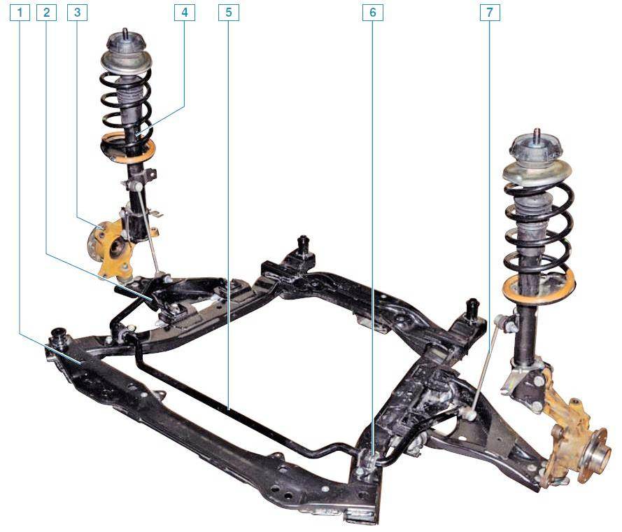 Передняя подвеска: 1 – подрамник; 2 – рычаг подвески с сайлент-блоками и шаровой опорой; 3 – поворотный кулак со ступицей и подшипником; 4 – амортизаторная стойка; 5 – штанга стабилизатора поперечной устойчивости; 6 – подушка стабилизатора поперечной устойчивости; 7 – стойка стабилизатора поперечной устойчивости
