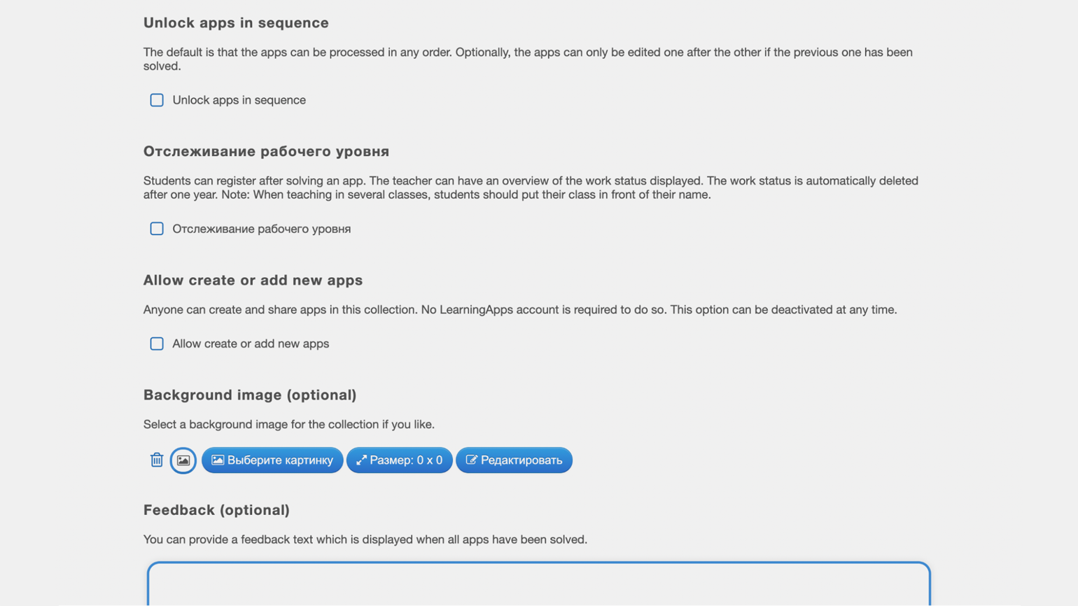 - Feedback — если вы заполните это поле, ученики увидят это сообщение, когда пройдут все упражнения в коллекции.