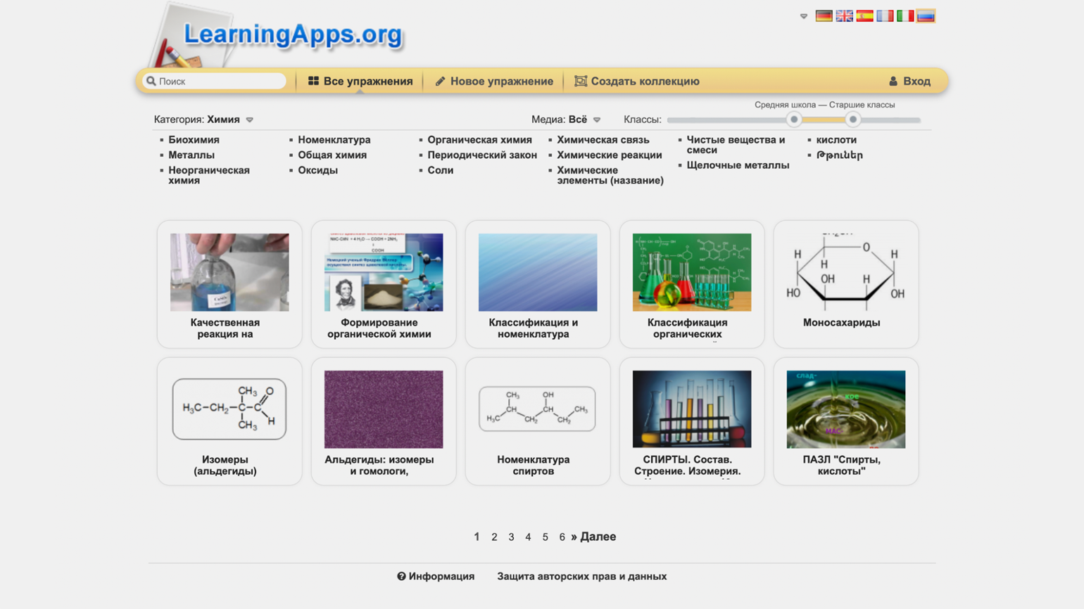 Чтобы открыть каталог, нужно нажать на кнопку «Все упражнения». Далее можно выбрать категорию и подкатегорию (скажем, «Химия» → «Органическая химия»), а также определить целевую аудиторию на шкале справа (например, «Средняя школа — старшие классы»). У слова «Медиа» настраивается вид контента, используемый в упражнениях, — изображения, аудио или видео. Это пригодится, если, например, из-за технических ограничений вам подойдут только варианты со статичными картинками.