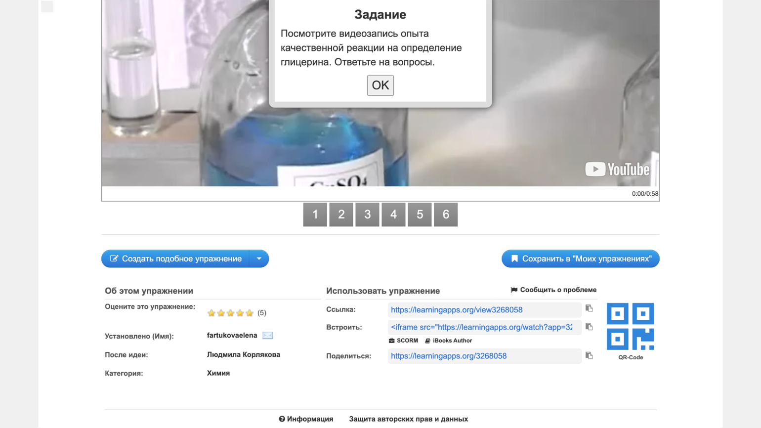 По клику откроется страница упражнения, и можно будет его просмотреть. А вот ниже находятся ссылки и QR-код, с помощью которых упражнение можно использовать на своём занятии.