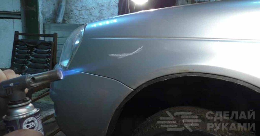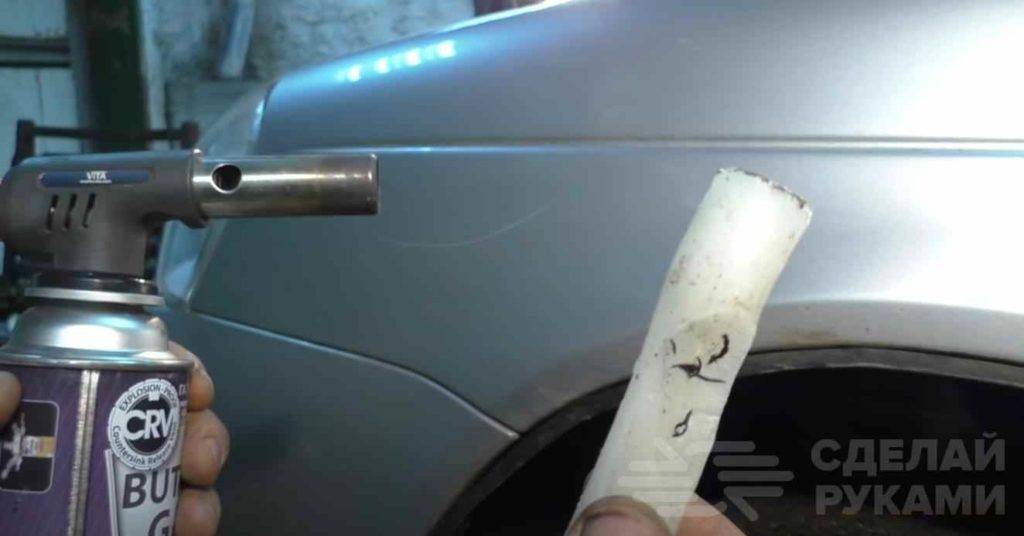 Чтобы устранить небольшую царапину на кузове, будем использовать свечу из воска и туристический газовый баллончик с горелкой. Если под рукой нет газового баллончика, тогда можно использовать строительный фен.