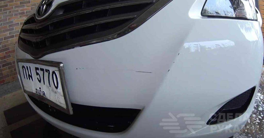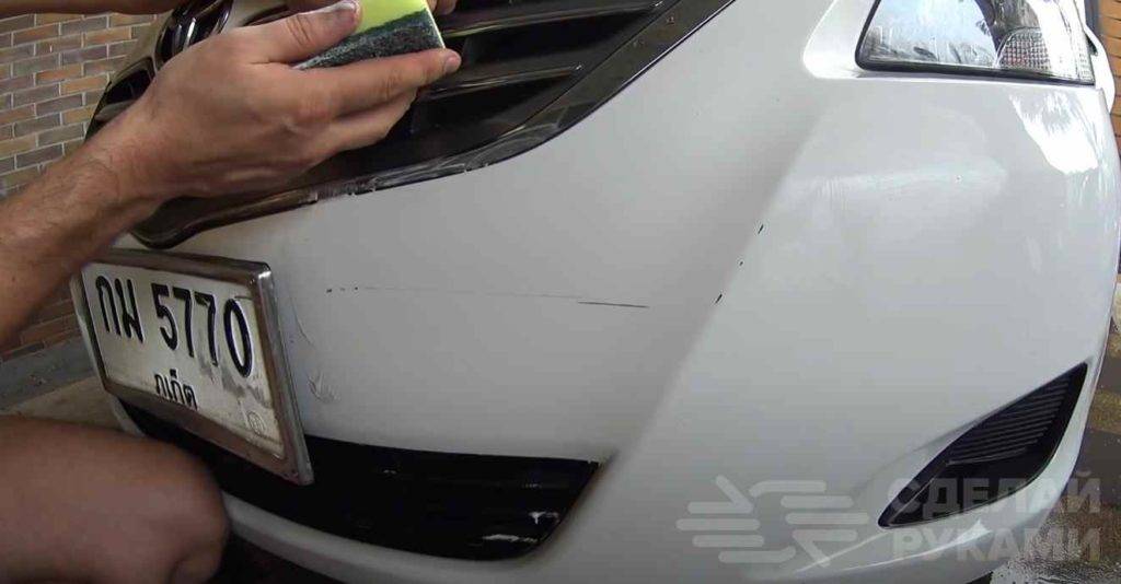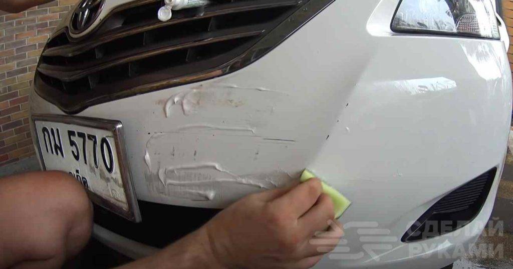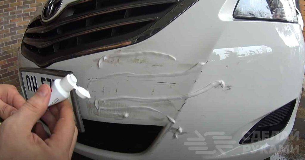 Приступаем к работе. Первым делом необходимо нанести зубную пасту на поврежденный участок автомобиля.