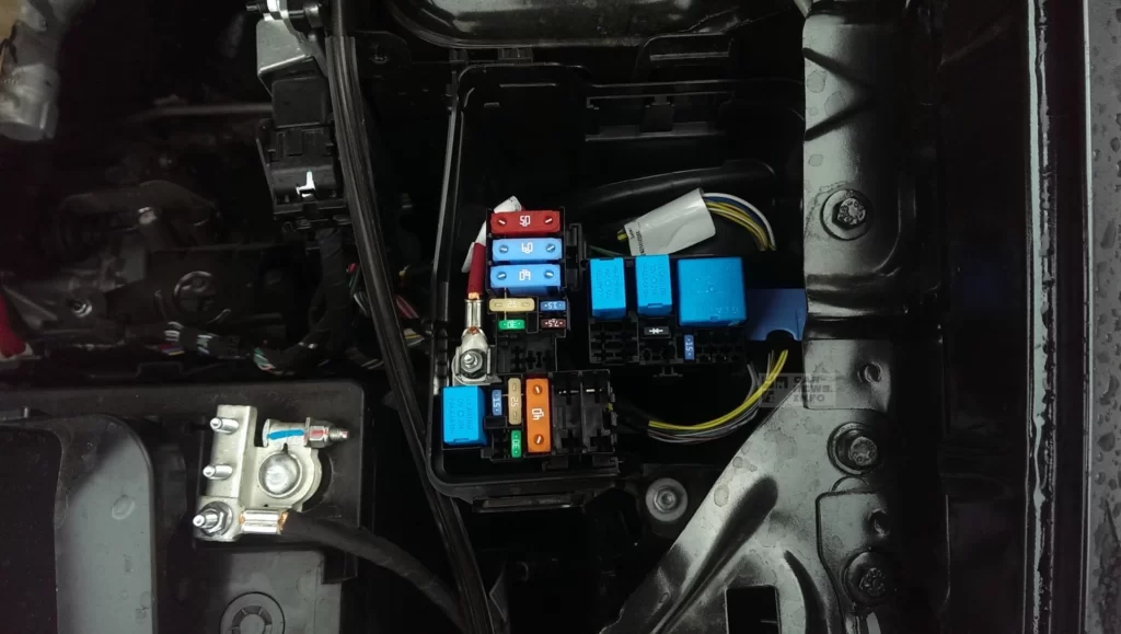 Монтажный блок находится с левой стороны, рядом с аккумулятором и закрыт пластиковой крышкой.