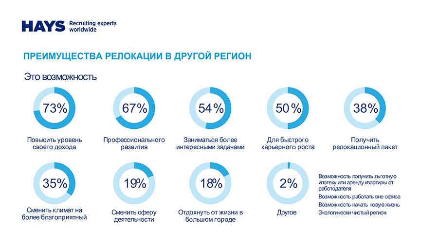73% профессионалов считают, что релокация — это возможность повысить уровень своего дохода, а 67% рассматривают это в качестве профессионального развития. 54% уверены, что релокация — это более интересные задачи, а 50% считают, что это шанс для быстрого карьерного роста.