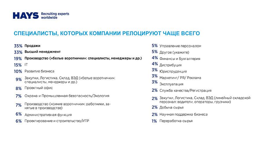 Работодатели выделили 3 основные области, из которой специалистов релоцируют чаще всего. Ими оказались: продажи — 35%, высший менеджмент — 33% и производство — 19%. В среднем в год компании закрывают 25 региональных позиций при помощи релоцированных кандидатов. Это составляет 17% от общего количества региональных позиций.