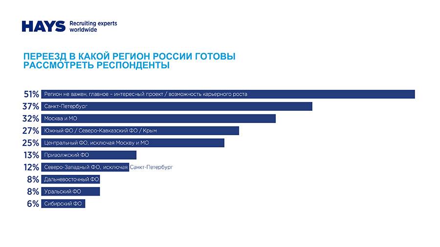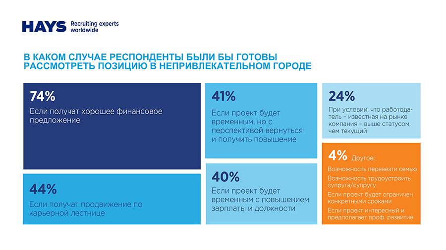 Самыми непривлекательными для релокации городами России, по мнению профессионалов, стали: Благовещенск, Челябинск, Кемерово, Хабаровск и Тобольск. Однако 74% респондентов готовы рассмотреть переезд в непривлекательный город, если получат хорошее финансовое предложение, 44% — если им предложат продвижение по карьерной лестнице, 41% — при условии временного проекта с перспективой вернуться и получить повышение по службе.