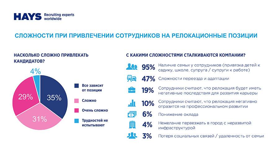Опрошенные работодатели назвали 2 основные проблемы при релокации специалиста. Самой главной — ее указали 95% компаний — стало наличие у сотрудника семьи: привязка детей к садику, школе и супруга к работе. 47% видят сложность в адаптации к переезду.