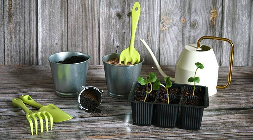 Рассада и необходимый инструмент, в том числе и специальная леечка для полива рассады