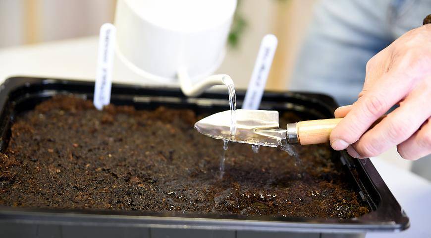 Мелкие семена аккуратно распределите по поверхности сырого грунта, крупные разложите поштучно в лунки и слегка углубите.